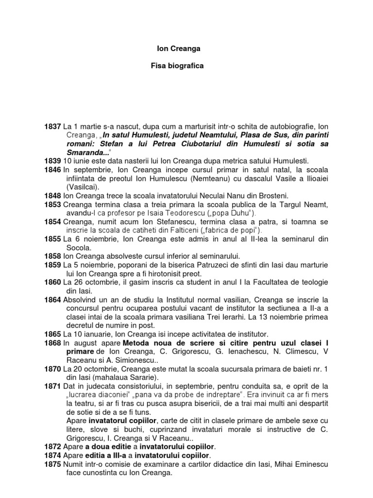 Ion Creanga Biografie Anideșcoală Ro
